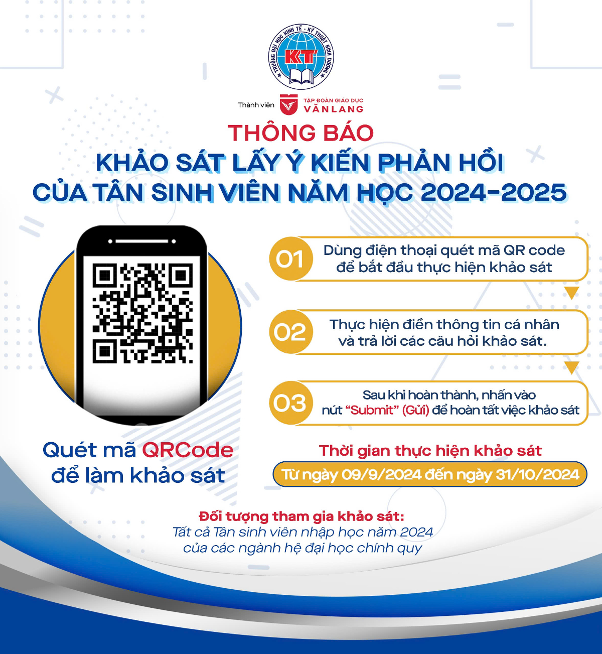 Trường Đại học Kinh tế - Kỹ thuật Bình Dương thông báo khảo sát lấy ý kiến phản hồi của tân sinh viên năm học 2024-2025, cụ thể như sau: